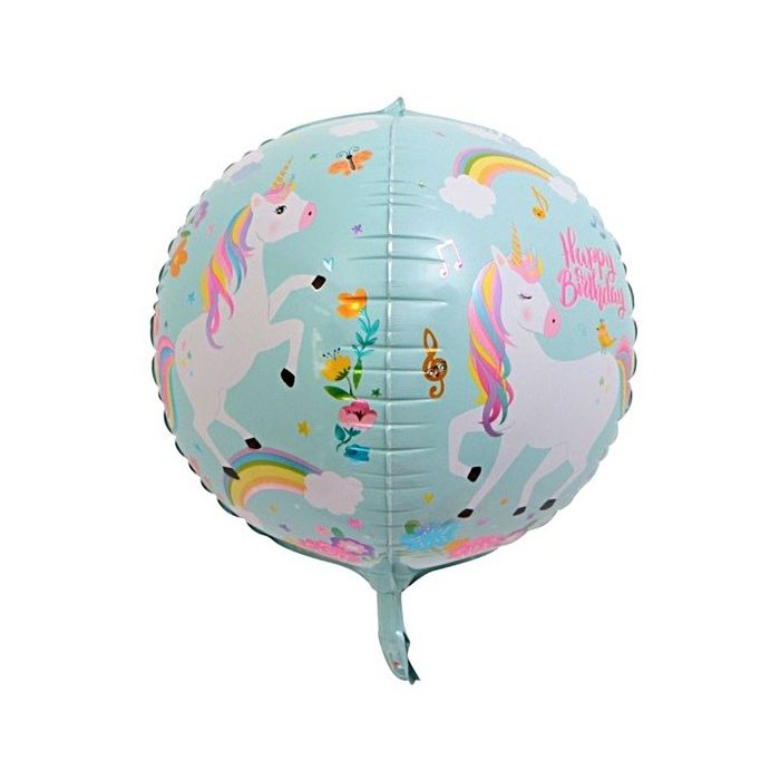Schattige 4D folieballon met unicorns en de tekst 'happy birthday'. De folieballon heeft opgeblazen een doorsnede van ongeveer 30 cm. Geschikt om met lucht of helium te vullen.