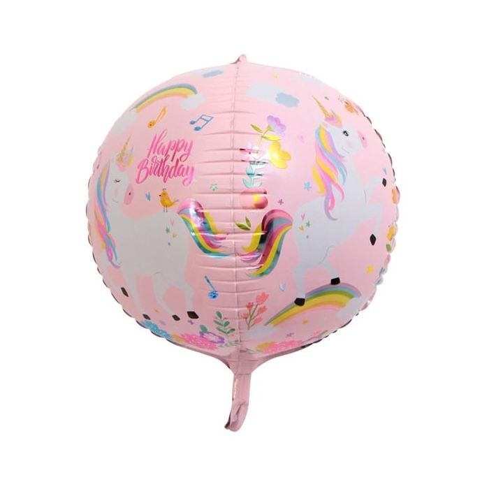 Schattige 4D folieballon met unicorns en de tekst 'happy birthday'. De folieballon heeft opgeblazen een doorsnede van ongeveer 30 cm. Geschikt om met lucht of helium te vullen.