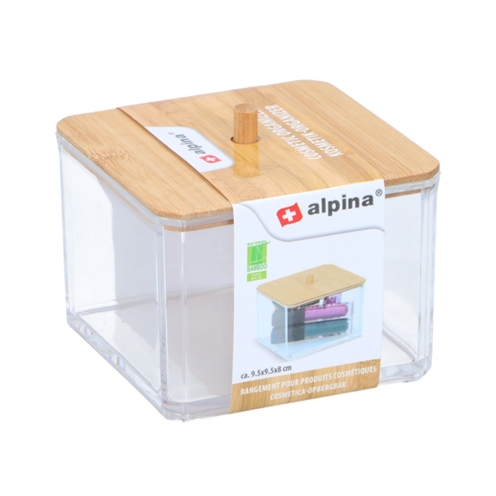 Praktische en mooie cosmetica organizer met bamboe deksel van het merk Alpina. De organizer heeft een afmeting van 9,5x9,5x8cm.