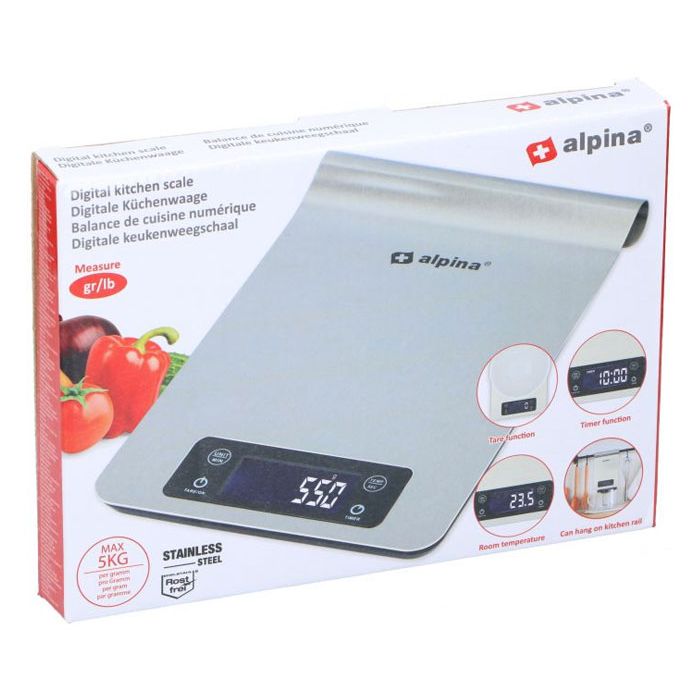Nauwkeurig je ingrediënten afwegen is het geheim van een goede kok. De ophangbare digitale keukenweegschaal van kwaliteitsmerk Alpina werkt dan ook uiterst precies. Je kunt er tot 5 kilo op afwegen en daarbij kun je kiezen of je dat in grammen, kilo's, pounds (lb) of ounces (oz) doet.