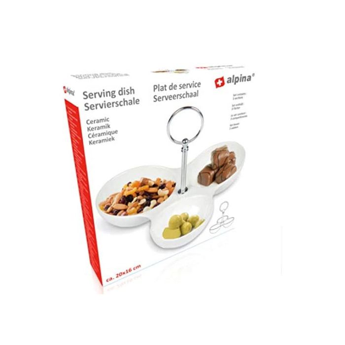 Zorg voor meer sfeer op tafel tijdens de borrel of een gezellig avondje met deze 3-vaks serveerschaal van Alpina. De schaal is zo ontworpen dat je gemakkelijk drie soorten snacks kunt scheiden.