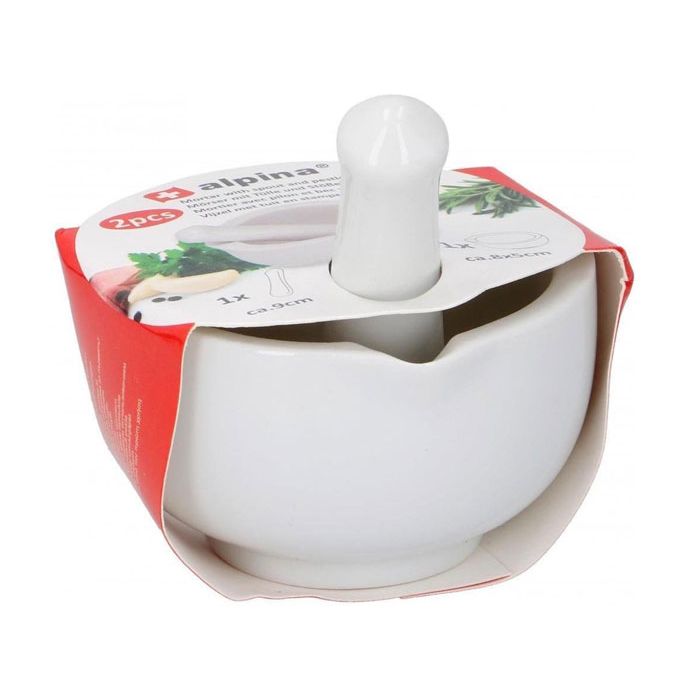 Porceleinen vijzel met tuit en stamper van Alpina. De vijzel heeft een doorsnede van 8cm en is 5cm hoog. De stamper heeft een lengte van 9cm.