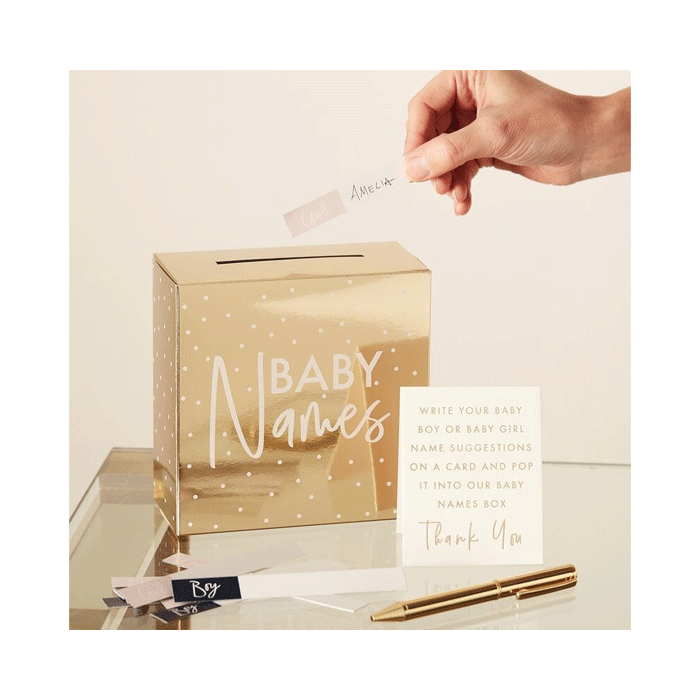 Goudkleurige namen box van Ginger Ray voor het raden van de naam van de kleine. Laat de gasten tijdens de babyshower of gender reveal op een kaartje de naam opschrijven en stop deze in de naam box. De set bestaat uit 1 box en 60 kaartjes.