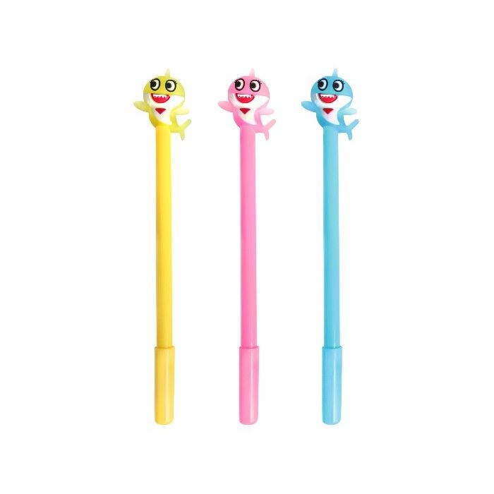 Softplastic baby shark pennen met een fijne blauwe punt. De pen is 18,5 cm lang. Een pak bevat 4 pennen. De kleuren van de pennen kunnen per pak verschillend zijn.