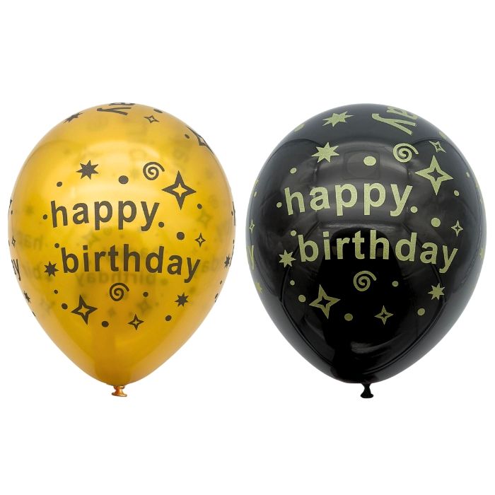 Set van 10 ballonnen bedrukt met de tekst 'happy birthday'. Elke verpakking bevat 5 zwarte en 5 gouden ballonnen. Ideaal als versiering voor elk verjaardagsfeestje!