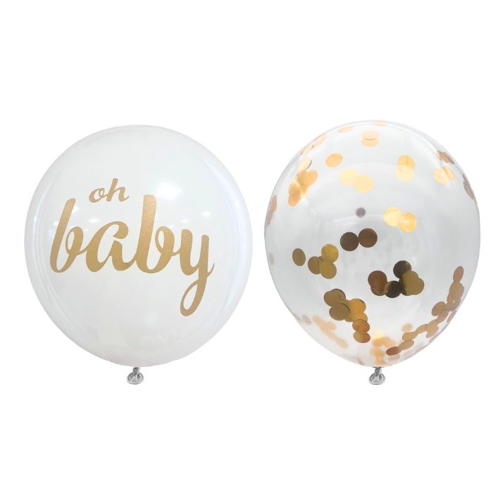Set van tien ballonnen voor een babyshower of gender reveal! De verpakking bevat vijf transparante ballonnen gevuld met gouden confetti en vijf witte ballonnen bedrukt met de tekst 'Oh Baby' in het goud. Met deze set ballonnen maak je je feestje compleet! De ballonnen kunnen met helium of lucht worden gevuld en zijn max. 30 cm groot.