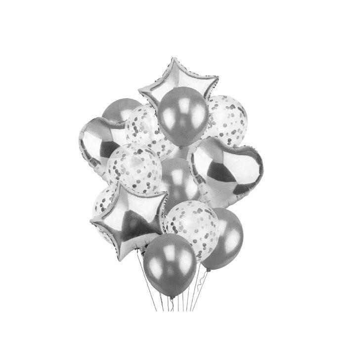 Mooie ballonnentros set in het zilver. De set bestaat uit 5 latex ballonnen, 5 confetti ballonnen, 2 stervormige folieballonnen en 2 hartvormige folieballonnen. Inclusief rol lint. Deze ballonnentros is perfect voor elk feestje, van babyshower, verjaardagsfeest tot aan een bruiloft. Wannneer je de latex ballonnen thuis of op de feestlocatie opblaast met een helium tank, blijven de ballonnen gemiddeld 5 tot 7 uur zweven.