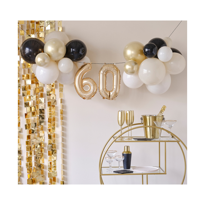 Toon deze stijlvolle ballonslinger op je 60e verjaardag voor een luxe uitstraling. Deze mijlpaal slinger heeft een prachtige mix van champagne goud, zwart en nude ballonnen die er geweldig uit zullen zien als je de hele nacht door feest!