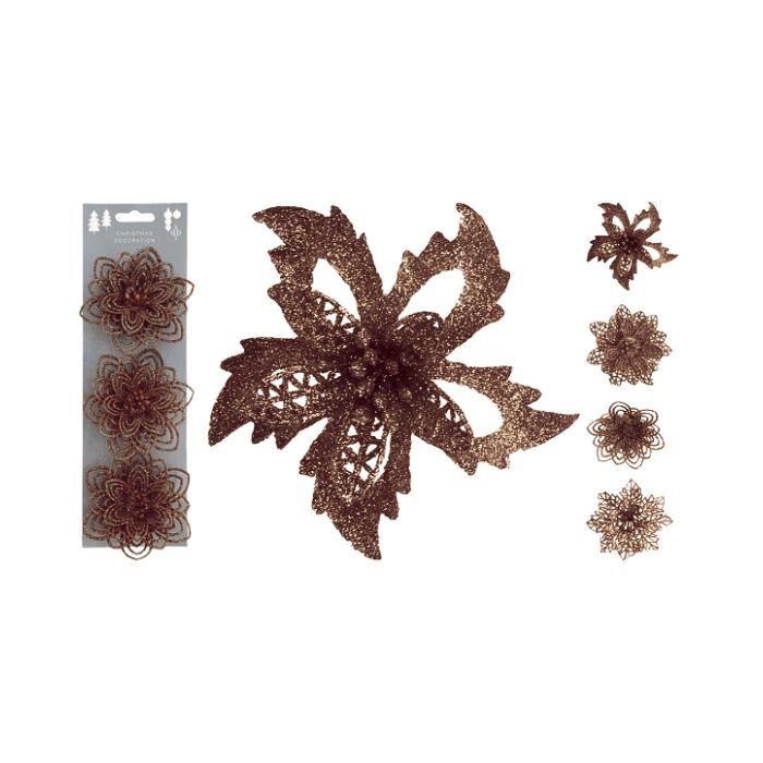 Een glitter bruine bloem op een clip. Perfect voor het versieren van een kerstboom, cadeau of bloemstuk. De bloem op clip heeft een diameter van ongeveer 10cm. Een set bevat drie bloemen. Let op: de bloem is beschikbaar in verschillende uitvoeringen, je ontvangt een willekeurige uitvoering.