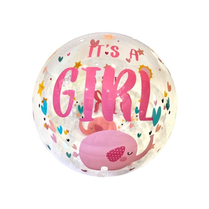 Bubble ballon met de tekst 'It's a Girl' met een diameter van ongeveer 60 cm. Bubble ballonnen zijn gemaakt van doorzichtig rekbaar kunststof. Bubble ballonnen rekken enorm uit tot ze een mooie ronde vorm hebben, zonder kreukels bij de naden. Voor het vullen heb je een goede ballonnenpomp nodig of heliumtank met latex ventiel. Het voordeel van deze ballon is dat hij niet oxideert en dat je er doorheen kunt kijken, dit zorgt voor een 3D effect.