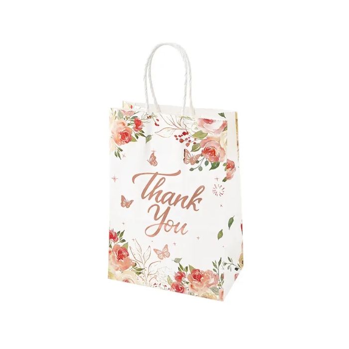 Perfect voor elke gelegenheid, deze prachtige papieren cadeautasjes voegen een vleugje elegantie toe aan je geschenken. Met hun bloemen, vlinders en de sierlijke tekst "Thank You" in rosegoud folie, stralen deze tasjes een gevoel van dankbaarheid en schoonheid uit. De afmetingen van 21 x 15 x 8 cm maken ze ideaal voor het verpakken van kleine tot middelgrote cadeautjes. Met een verpakking van 6 stuks ben je klaar om je waardering en liefde op een stijlvolle manier te tonen. Maak van elke gift een speciale verrassing met deze prachtige cadeautasjes.