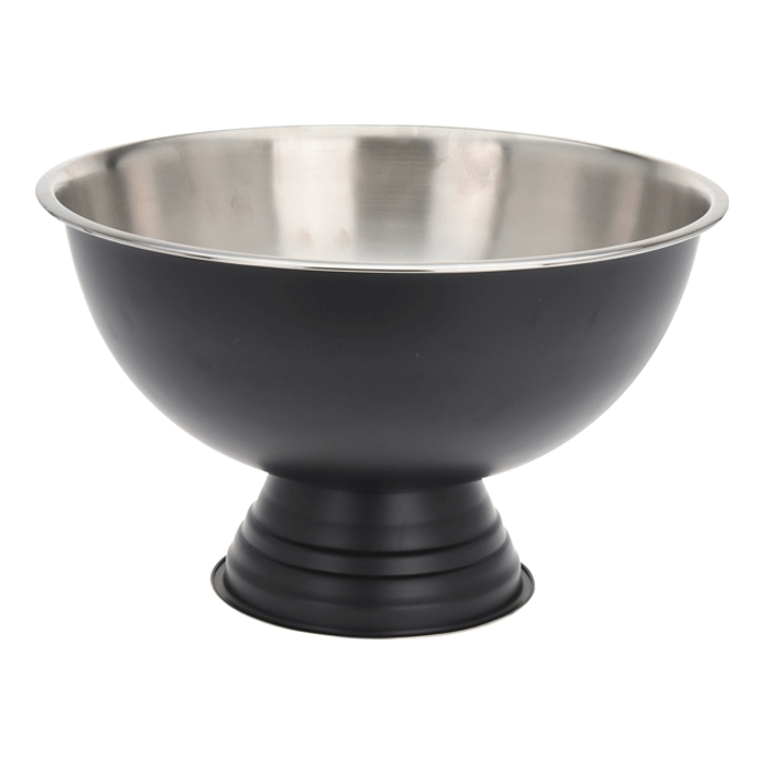 Zwarte schaal op voet, perfect voor gebruik als champagnekoeler. De bovenkant van de schaal heeft een diameter van ongeveer 40 cm.