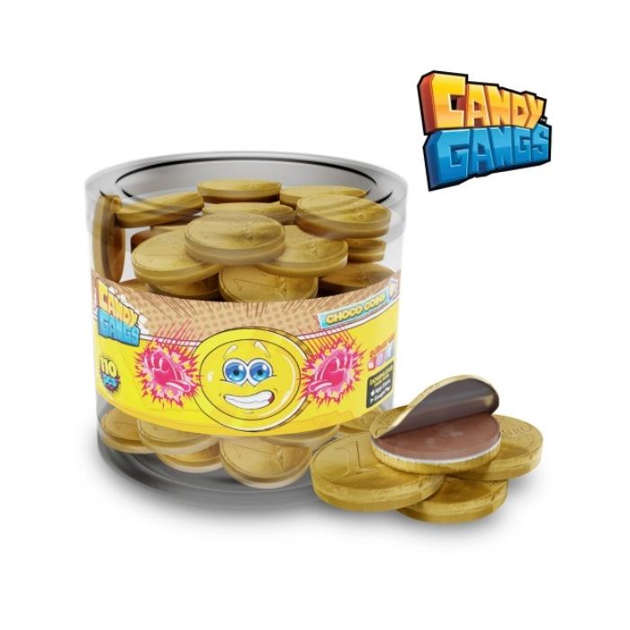 Chocolademunten in een silo, verpakt per 110 stuks. Elk muntje heeft een diameter van circa 27mm.