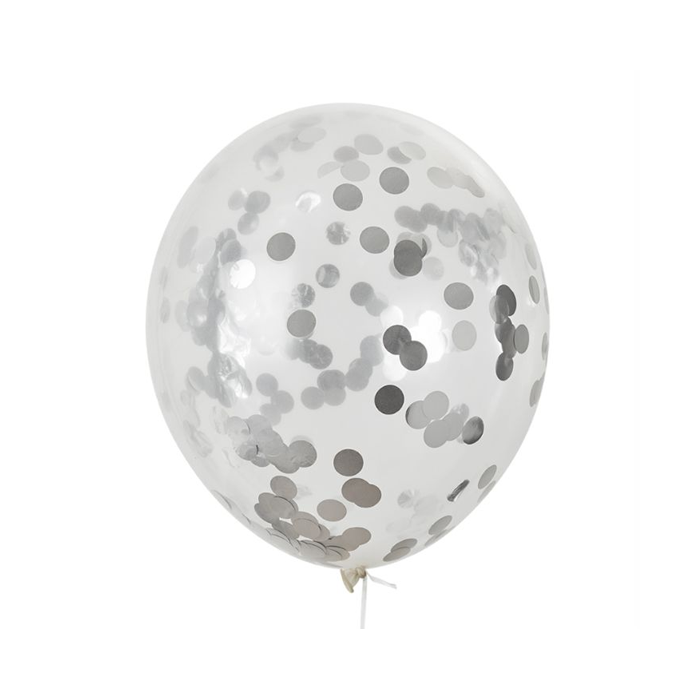 Transparante ballonnen met metallic zilveren confetti. De ballonnen kunnen tot 30 cm worden opgeblazen en zijn verpakt per 5 stuks.