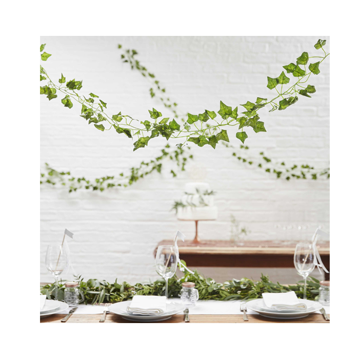 Hang deze prachtige klimop van het merk Ginger Ray boven de tafel of leg ze neer op tafel als een tafelloper. Versier jullie ceremonie stoelen ermee en creëer een echt botanic gevoel op jullie bruiloft. De klimop is 2 meter lang en de verpakking bevat 5 stuks, de klimop is zeer soepel zodat je het makkelijk kunt buigen en bevestigen.