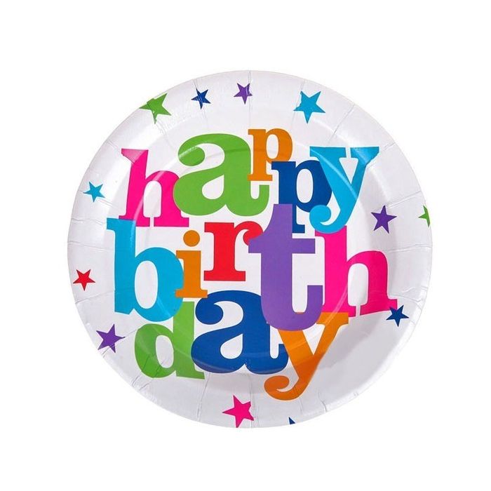 Kleurrijke kartonnen dessert borden met de tekst 'Happy Birthday' omringd door sterretjes.