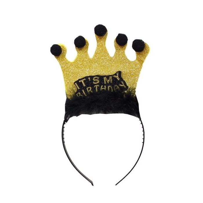 Plastic diadeem met kroon van vilt en de tekst 'It's My Birthday'. De diadeem is versierd met zwarte veertjes.