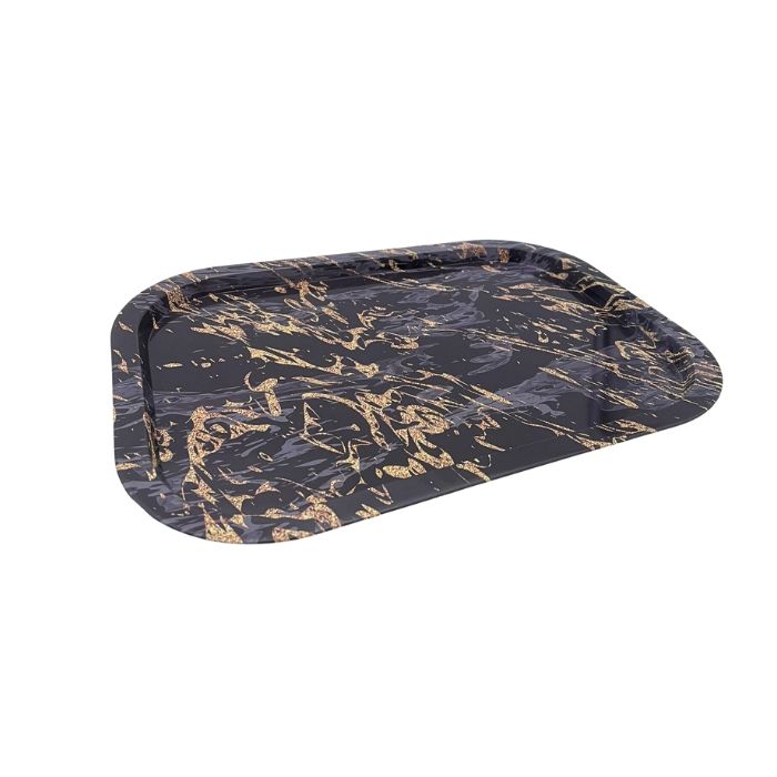 Metalen rechthoekig dienblad met zwart en goud marmer print. Ideaal voor het serveren van drankjes en eten of als decoratieve accessoire voor op tafel. Het dienblad heeft een afmeting van 40 x 29 cm.