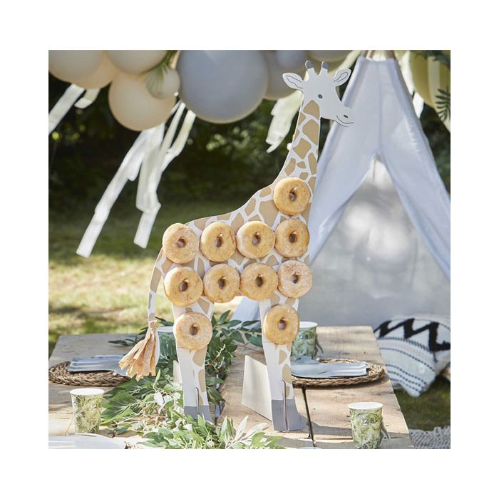 Gave donut standaard in de vorm van een giraf van het merk Ginger Ray. De verpakking bevat 1 donut standaard, in de vorm en kleuren van een giraffe! De standaard is eenvoudig in elkaar te zetten door middel van de steunen die je onderin het donut standaard schuift. Er zitten ook 11 stokjes bij, dus er is plaats voor 11 donuts. De standaard heeft een afmeting van 56x85cm (bxh).