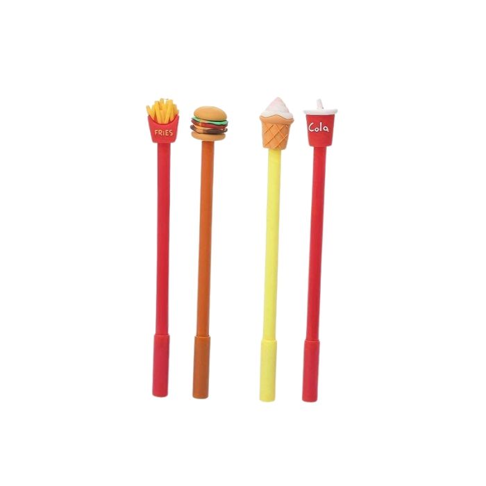 Softplastic pennen met een fijne blauwe punt en bovenop een fastfood figuur. De pen is 17,5 cm lang. Een pak bevat 4 pennen. De fastfood figuren van de pennen kunnen per pak verschillend zijn.
