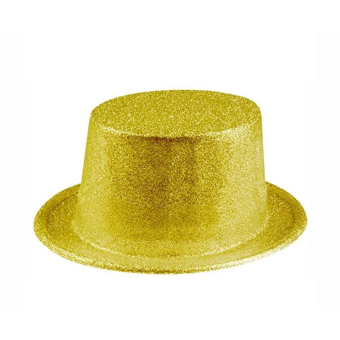 Goudkleurige feesthoedje bedekt met glitter. De uiterste afmetingen zijn 24x28x12cm (LxBxH). De binnen afmetingen zijn 17x20x12cm (LxBxH).