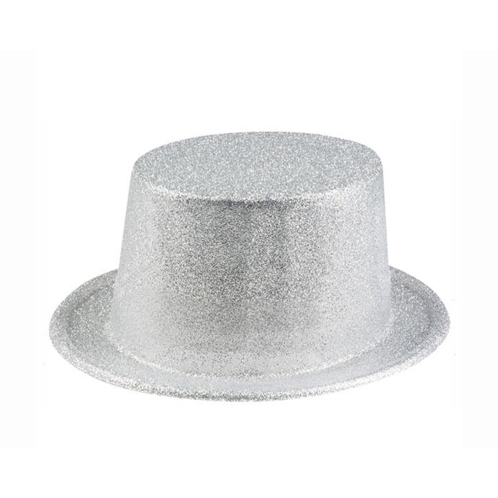 Zilver feesthoedje bedekt met glitter. De uiterste afmetingen zijn 24x28x12cm (LxBxH). De binnen afmetingen zijn 17x20x12cm (LxBxH).
