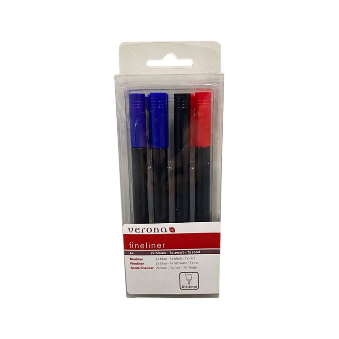 Set van vier fineliners in de kleuren rood, zwart en blauw.