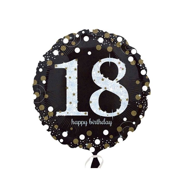 Zwarte folie ballon met metallic gouden en zilveren cirkels & sterretjes voor een 18e verjaardagsfeest. De ballon is 45 cm groot en kan met helium of lucht worden opgeblazen.