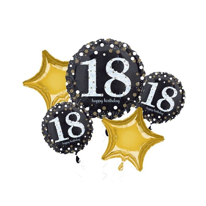 Boeket van 5 folie ballonnen voor een spetterende 18e verjaardag. De set bestaat uit:
