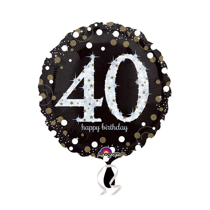 Zwarte folie ballon met metallic gouden en zilveren cirkels & sterretjes voor een 40e verjaardagsfeest. De ballon is 45 cm groot en kan met helium of lucht worden opgeblazen.