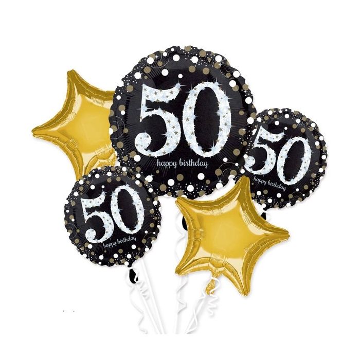 Boeket van 5 folie ballonnen voor een spetterende 50e verjaardag. De set bestaat uit: