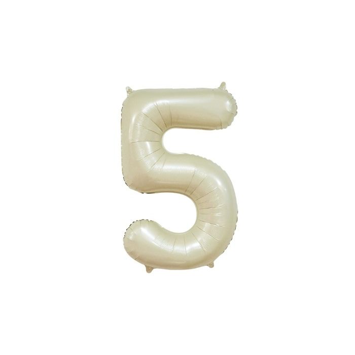 Vier een speciale verjaardag of belangrijk jubileum in stijl met deze schitterende creme folieballon in de vorm van het cijfer vijf. Met een indrukwekkend formaat van 86 centimeter vormt deze ballon direct het stralende middelpunt van jouw feestlocatie. De elegante subtiele glans geeft de decoratie een luxe sfeer die perfect past bij elke bijzondere mijlpaal.