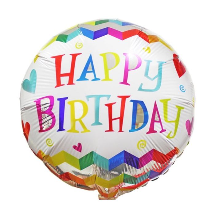 Kleurrijke folieballon met daarop de tekst "Happy Birthday". De ballon heeft daarnaast gekleurde chevron strepen en hartjes. Leuk om als cadeau te geven aan iemand!