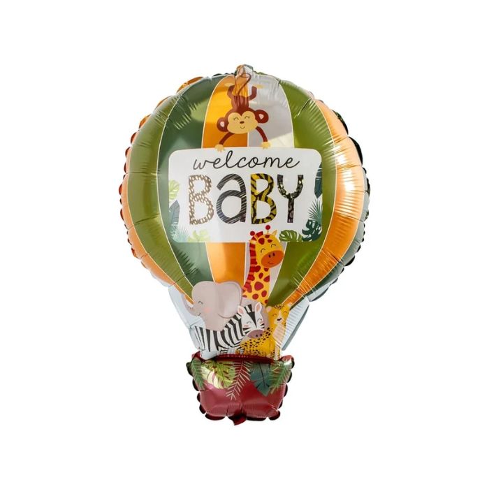 Schattige folieballon in de vorm van een luchtballon met jungle dieren zoals een giraf, olifant, zebra, aap en panter. Op de luchtballon staat de tekst 'welcome baby'. De folieballon is circa 90 x 58 cm groot en kan met lucht of helium worden gevuld. Ideaal voor een babyshower, gender reveal of kraamvisite.