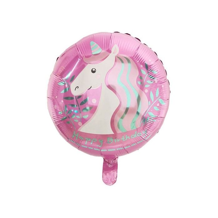 Roze folieballon met een afbeelding van een eenhoorn en de tekst 'Happy Birthday'. De folieballon kan met lucht of helium worden opgeblazen en heeft een doorsnede van circa 30 cm (opgeblazen).