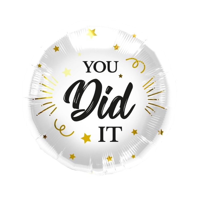 Gefeliciteerd met deze geweldige prestatie! De "You Did It" folieballon is een perfecte manier om de geslaagde te verrassen en te vieren. Met een afmeting van ongeveer 45 cm is deze witte ballon een opvallend en feestelijk gebaar. Of je ervoor kiest om de ballon met lucht of helium te vullen, het resultaat zal zeker een glimlach op het gezicht van de ontvanger toveren. Laat deze ballon een symbool zijn van trots en vreugde voor dit belangrijke moment. Nogmaals, van harte gefeliciteerd!