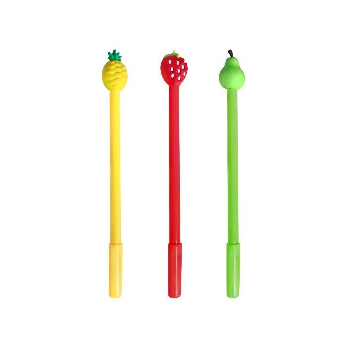 Softplastic fruit pennen met een fijne blauwe punt. De pen is 18,5 cm lang. Een pak bevat 4 pennen. De kleuren en de fruitsoort van de pennen kunnen per pak verschillend zijn.