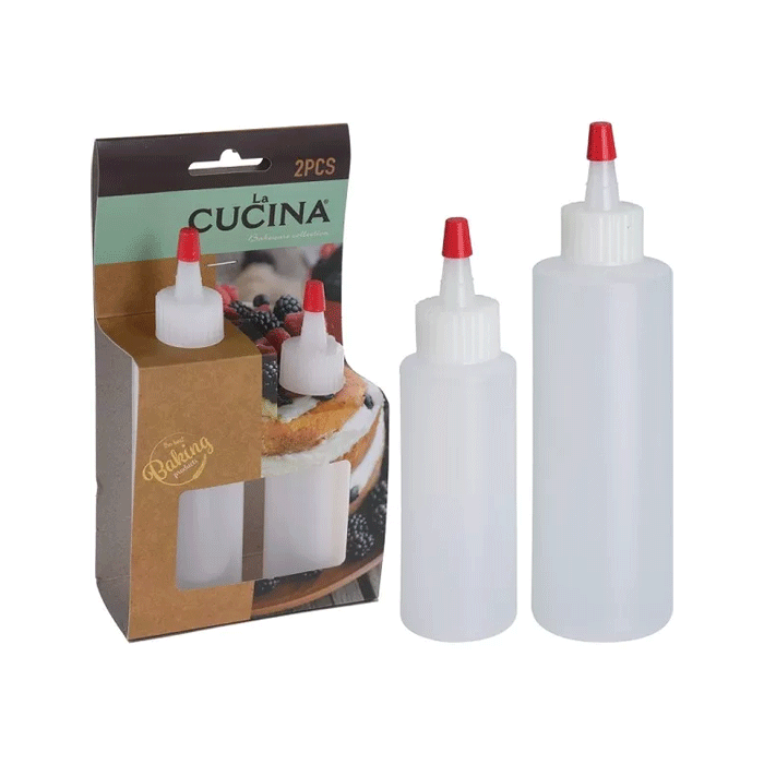 Versier je gerechten met verschillende sausjes door middel van deze garneerflesjes. De flesjes helpen je met doseren en zorgen ervoor dat je netjes kan werken. De set bestaat uit twee garneerflessen met een inhoud van 60 en 120 ml.