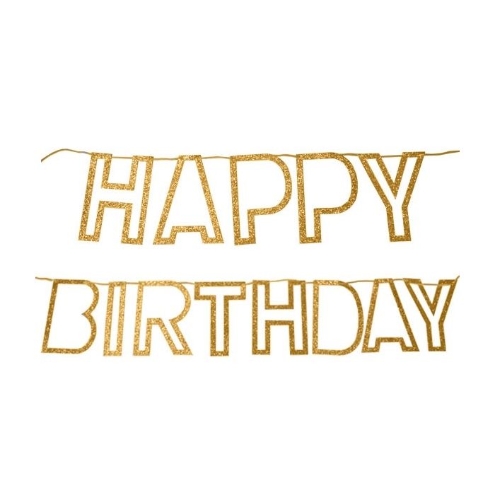 Sprankelende Happy Birthday glitterslinger in het goud. De letters zijn 10 x 15 cm en zijn gemaakt van stevig papier. De slinger bevat een lint om de slinger op te hangen.
