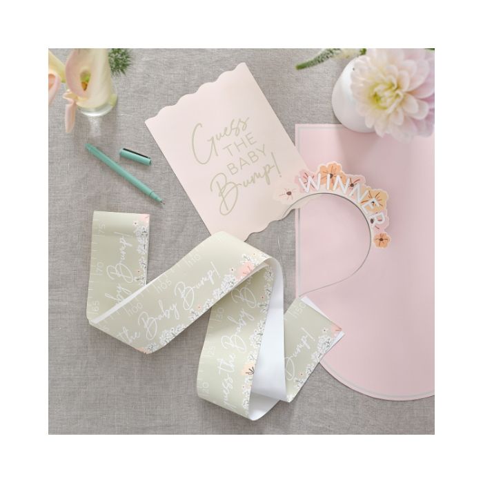Guess the bump is een klassiek babyshowerspel waar iedereen aan mee kan doen! Wie kan raden hoe groot mama's buik is? Schrijf je voorspellingen op om te zien of je er het dichtst bij kunt komen en de winnaarshoofdband kunt winnen! Een leuk spel voor iedereen. Voeg een bloemig tintje toe met deze prachtige babyshowercollectie. Deze collectie barst van de fijne bloemendetails en zit vol met babyshowerversieringen die perfect zijn voor een brunch of een afternoon tea om de aanstaande mama te vieren.