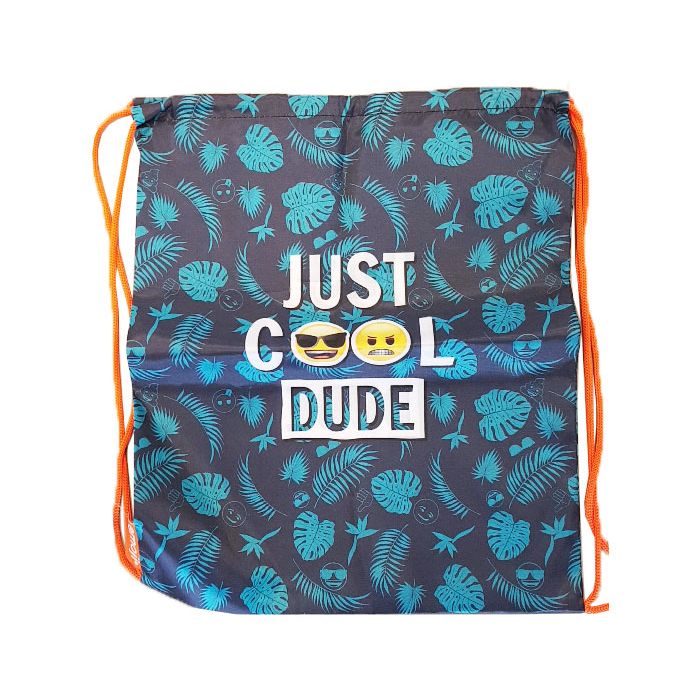 Leuke Emoji gym/zwemtas die met trekkoorden dicht gaat. Ideaal voor je zwem, gym of sportkleding. De tas heeft een vrolijk uiterlijk met twee emoji's, de tekst 'Just Cool Dude' en een donkerblauwe achtergrond met tropische bladeren. De tas is aan beide kanten geprint.