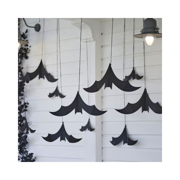 Met deze Halloween vleermuis versiering van Ginger Ray zal iedereen gegarandeerd schrikken. Deze milieuvriendelijke versiering kan zowel binnen als buiten je huis worden opgehangen. Elk pakket bevat 10x zwarte hangende vleermuizen in verschillende maten: