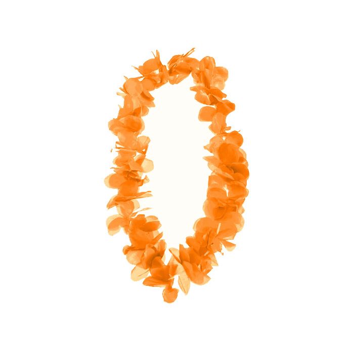 Zomerse Hawaii ketting in het oranje. De ketting heeft een lengte van 126 cm en de breedte van de bloemen zijn 8 cm.