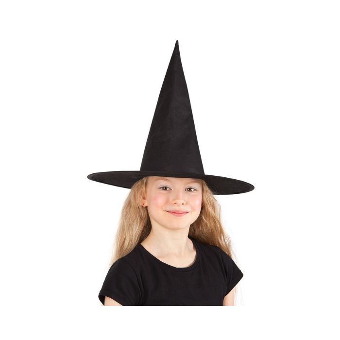 Kinderheksenhoed met opstaande punt. Deze zwarte heksenhoed is geschikt voor kinderen met een hoofdomtrek van maximaal 55 cm.