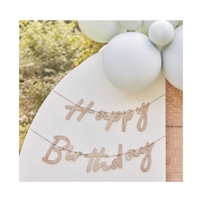 Stijlvolle houten slinger van Ginger Ray die de tekst 'Happy Birthday' vormen. De verpakking bevat twee stukken touw van 1,5 meter en de benodigde houten letters om aan te rijgen.