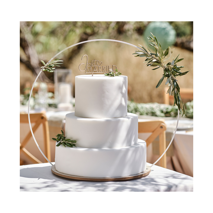 Breng je prachtige bruidstaart onder de aandacht met deze indrukwekkende bruidstaartstandaard van Ginger Ray. Je kunt hem aankleden met bloemen of takjes, zodat hij binnen jullie eigen thema past. De basis van het taartplateau is gemaakt van hout en heeft een doorsnede van 40 cm. De witte metalen boog bestaat uit 3 delen. De hoogte is 66 cm en de breedte 69 cm.