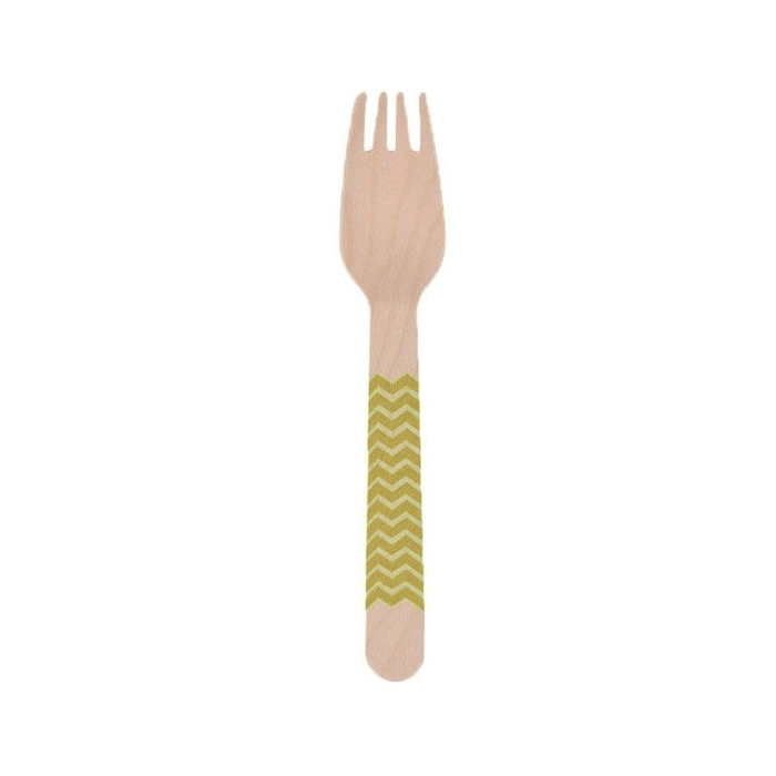 Houten vorken met gouden zigzap strepen (bedrukt aan één zijde). Een verpakking bevat 10 vorken. Afmeting: ca. 16 cm lang