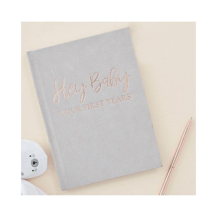 Invulboek met de tekst 'Hey Baby Your First Years' in roségouden folieletters van Ginger Ray. Het boek heeft een grijze suède omslag. In het boek staan in totaal 62 pagina's om in te vullen met feitjes, foto's en herinneringen van je dochter/zoon.