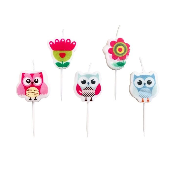 Kleine kaarsjes in de vorm een uil en bloem. Een verpakking bevat 5 kaarsjes.