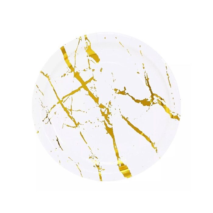 Kartonnen witte borden met gouden marmer effect. De borden hebben een doorsnede van 23cm en zijn verpakt per 20 stuks.